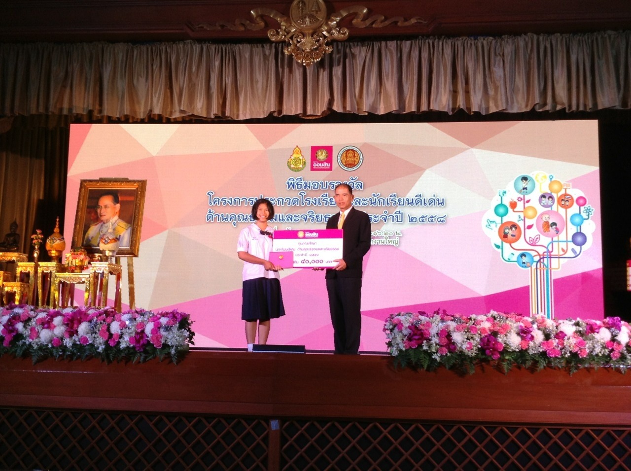 โรงเรียน ได้รับ 100,000 บาท ซึ่งจัดอยู่ในลำดับที่ 1-38 ที่ได้รับรางวัลทั่วประเทศ