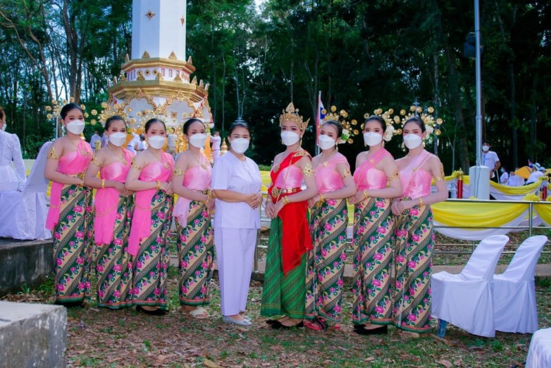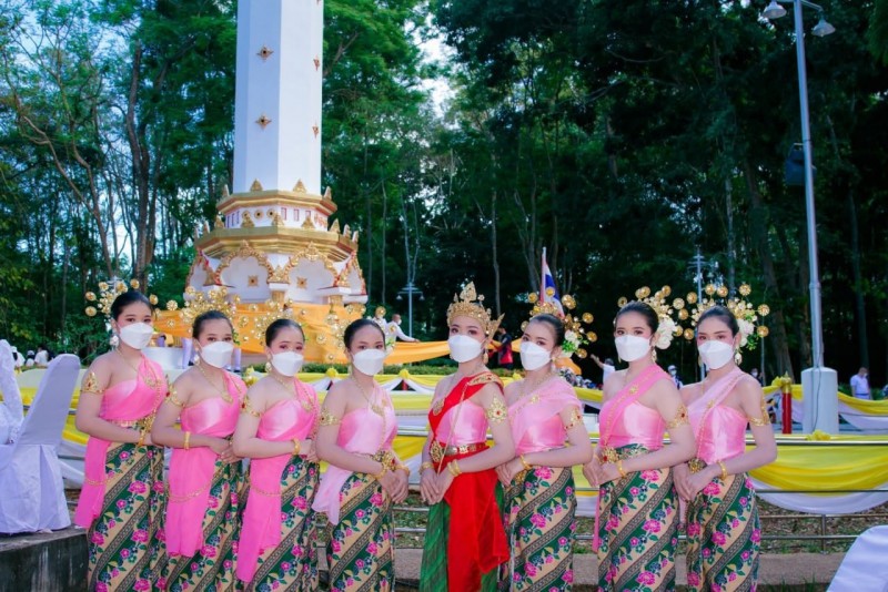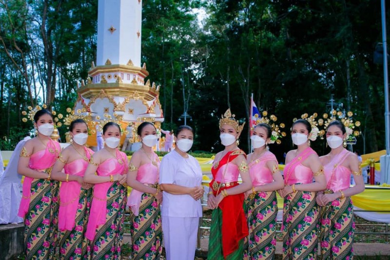 นักเรียนนาฏศิลป์ร่วมแสดงในชุดบูชาพระธาตุศรีสุราษฎร์ ภายใต้กิจกรรมแห่ผ้าห่มพระธาตุศรีสุราษฎร์ แลธรรมชาติเขาท่าเพชร ครั้งที่ 11 ประจำปี 2565